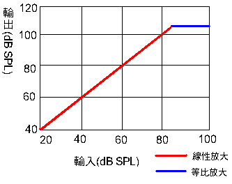 線性電路 ( Linear ) 線性電路是助聽器擴大器最常使用的一種線路,所謂線性放大就是聲音信號在輸入及輸出放大的比例是成等比放大,直到擴大器達到輸出飽和點又稱截峰點,一旦飽和輸出就不再增加,如右圖。 截峰是線性電路用來控制飽和輸出最常用的方法,可以有效防止傷害病人的殘存聽力。