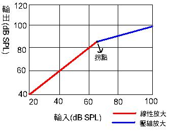壓縮線路 (Compression) 截峰電路雖然能限制助聽器的輸出,但卻會造成聲音的失真,而壓縮線路則可以改善聲音的失真,原理是助聽器在較高輸入時則變為低增益,使助聽器輸出處於飽和點及截峰點之下,如右圖。當助聽器輸入低於拐點(Knee Point)時,為線性放大。當輸入高於拐點(Knee Point)時,增益相應減小,這就是壓縮。 而依不同的聽力需求,會有不同壓縮比的設定。 |